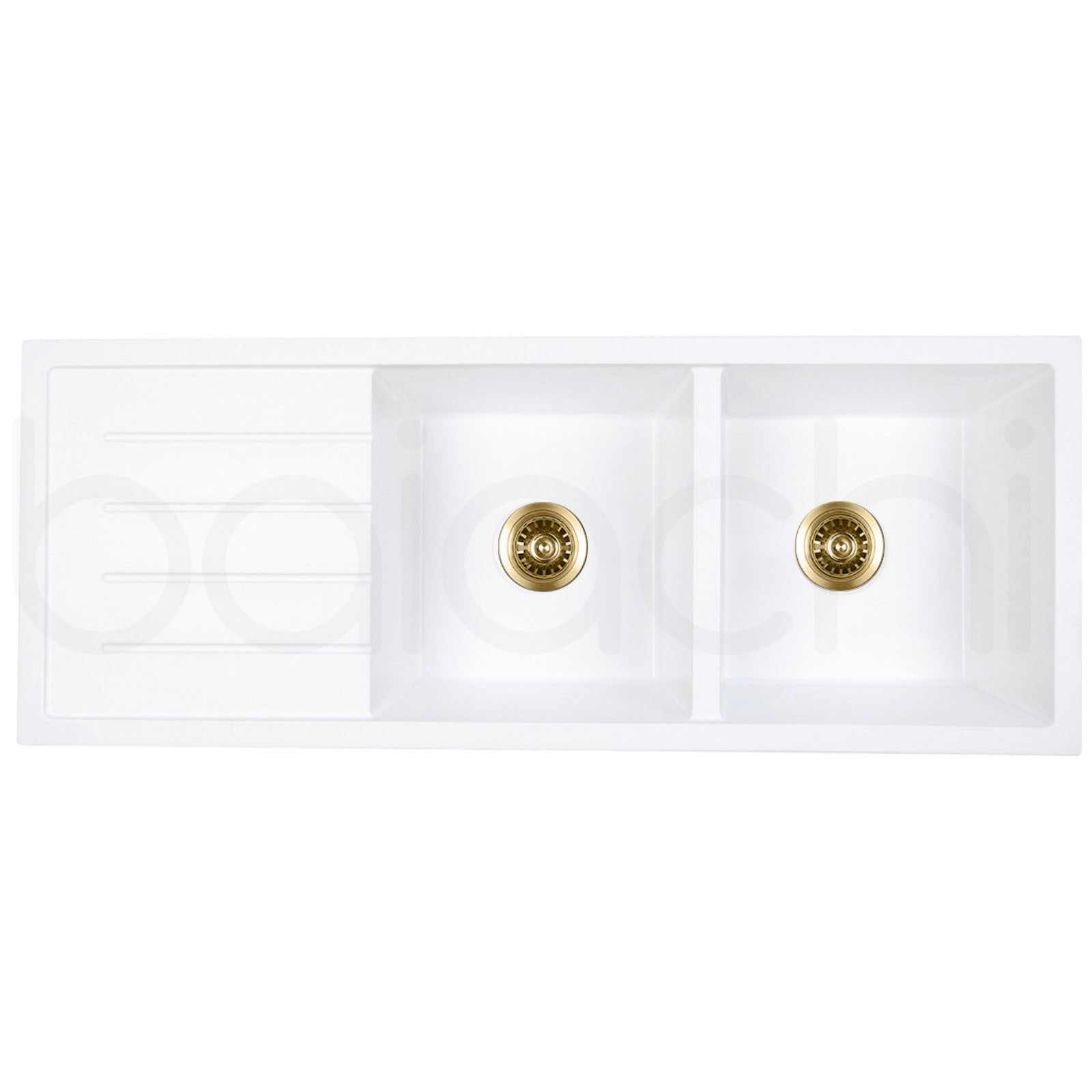 Baiachi 1160 x 450 Double Bowl and Drainer Granite Kitchen Sink White with Brushed Gold Waste