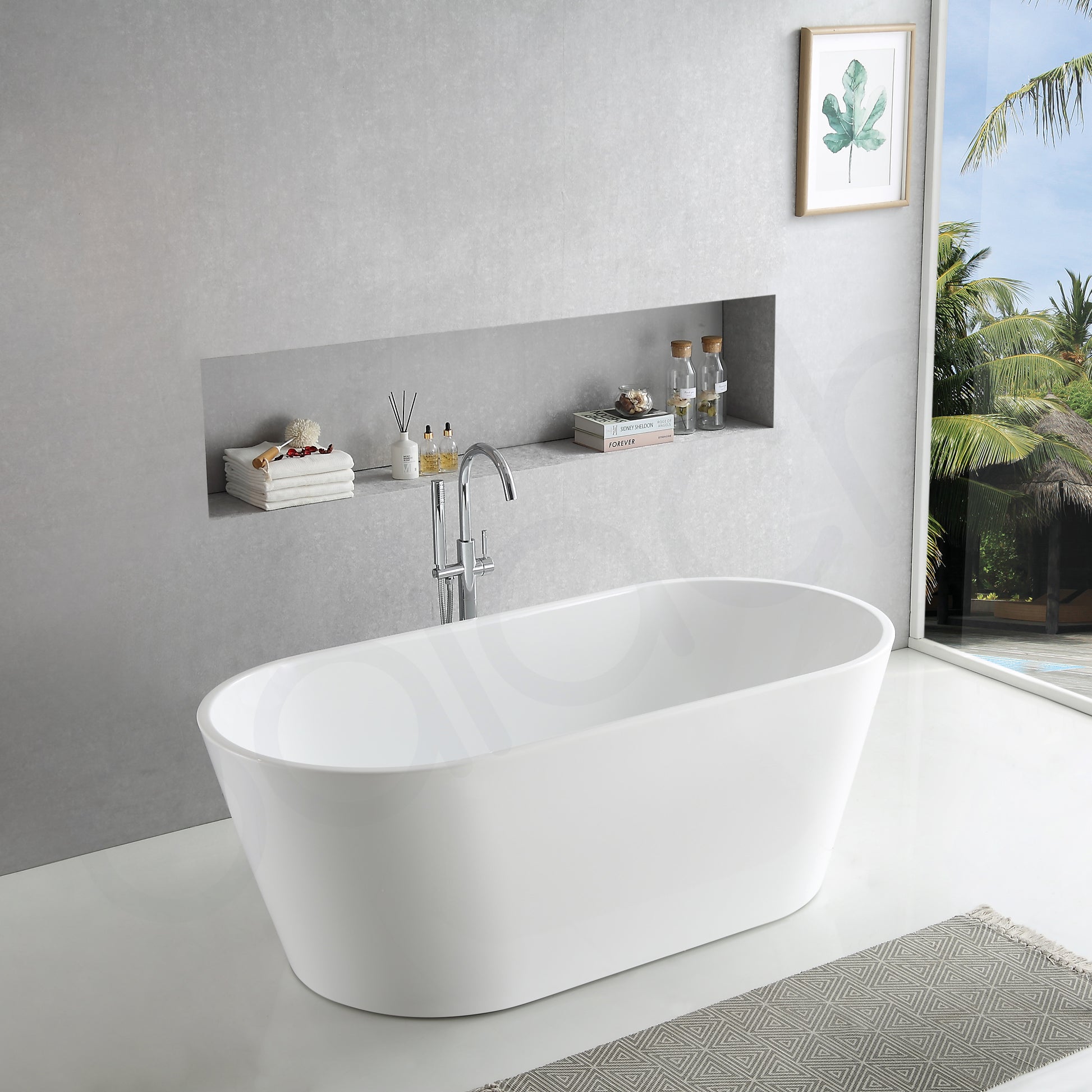 Quality oval freestanding bathtub Made of high-quality sanitary grade acrylic and reinforced fibre glass Features a white high gloss finish for sophistication. Has a thin edge design for a modern appearance? Offers comfortable bathing space. Comes with adjustable feet for stability. Waste Not Included